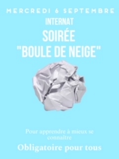 Ce mercredi avait lieu la soirée d’intégration de nos internes sous le thème « boule de neige ». Sur un papier, chacun devait indiquer son animal totem, son plat préféré et le métier qu’il souhaite faire avant de le froisser et de le mettre au centre. Ensuite, chaque élève devait tirer une boule au hasard et retrouver « son propriétaire ». Un bon moyen de faire connaissance et d’apprendre à se connaître !